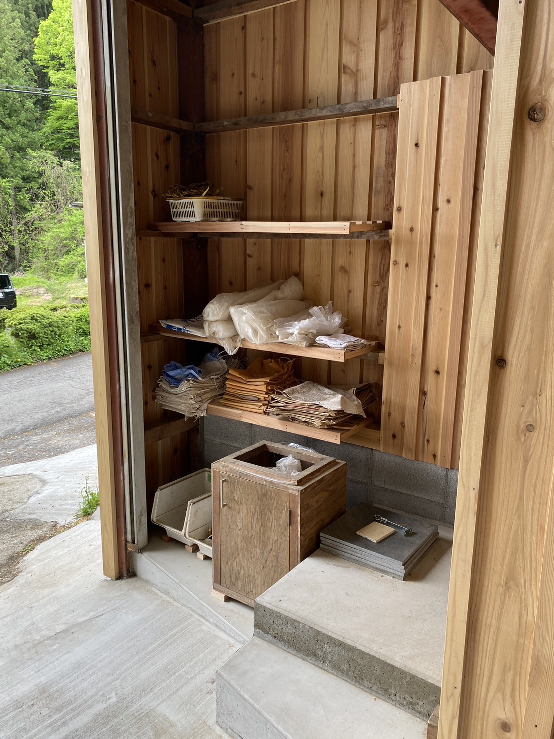 現状把握は十分できていますが、まずはノートに問題点、良い点、理想のものを書き出してみることにしました。それらを基にスケッチを描いてみたり作り方を考えたりしてみますが、「これって本当に大丈夫なの?」や「どこにどうやって留めたら強度が上がるかな?」などという疑問がたくさん出てきます。期限があるので制作の方を早めに進めたいのですが、これといったプランが出てこず時間だけが過ぎていきます。迷ってるだけでは進まないので棚の作り方をトモさんに聞きました。「外したこの建具使っちゃえばいいんじゃない。」「ここ切っちゃえば高さ揃うから切っちゃえば?それかこっちを上げるか?」
