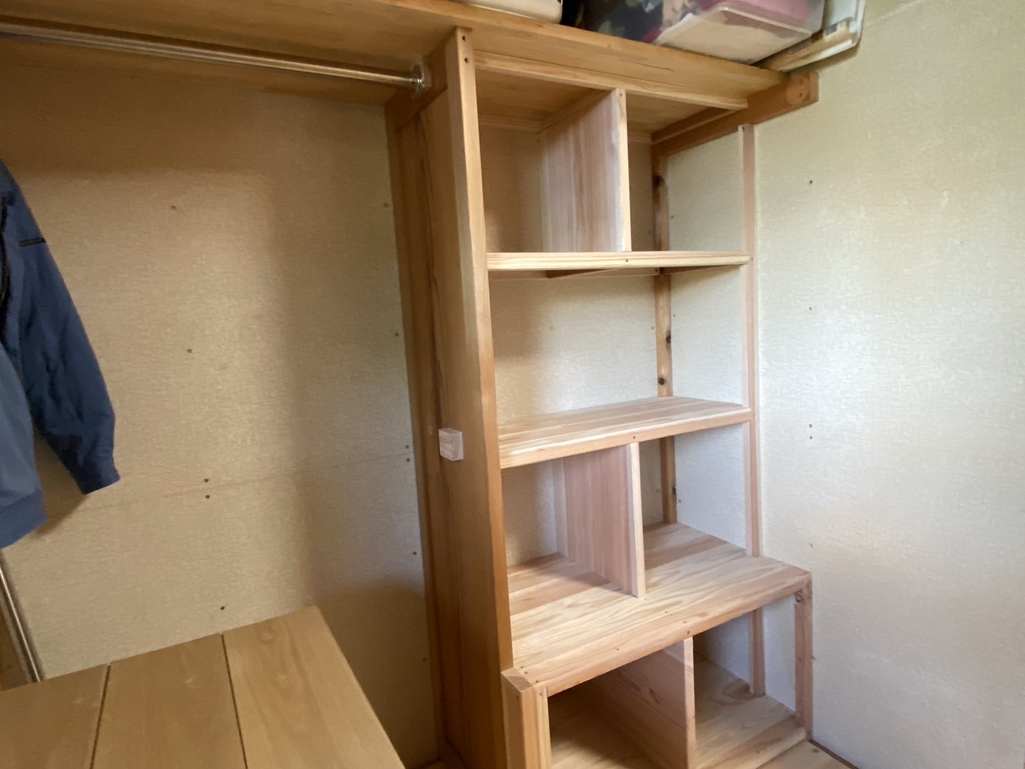 だけど、『ピンチはチャンス!』。聞くことができないので自分で調べて、好きなものを好きなように作れちゃいます。また、押入の棚を作る時に、試験その1で教わった強度を上げるためのアドバイスが活きてきます。四角い箱を作ることがポイント!今までの経験を基に作業をしているので、作業する手はあまり止まらずにできていました。