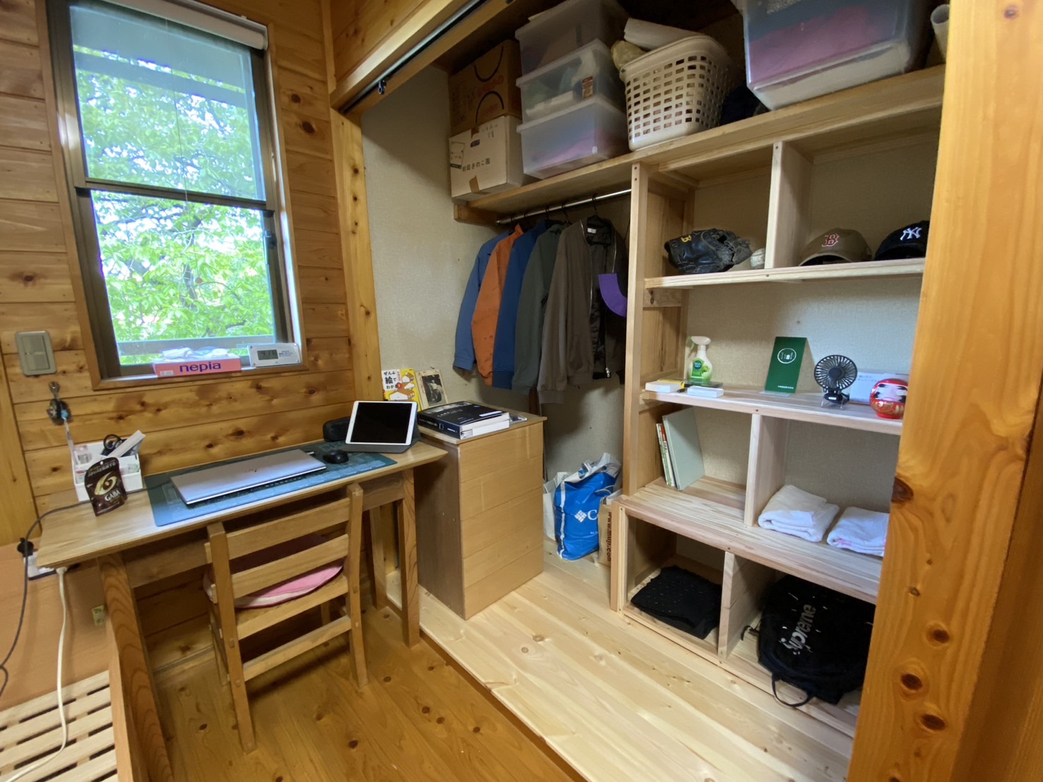 この部屋は、今は僕が使っていますが、修行が終わる1か月半後には中澤家の次男である小学校6年生のタイラ君が使う予定です。現状だと押入には荷物がたくさんあるので押入は使えず、押入を除いた4畳の部屋はベッドが半分を占めておりとても狭苦しく感じます。