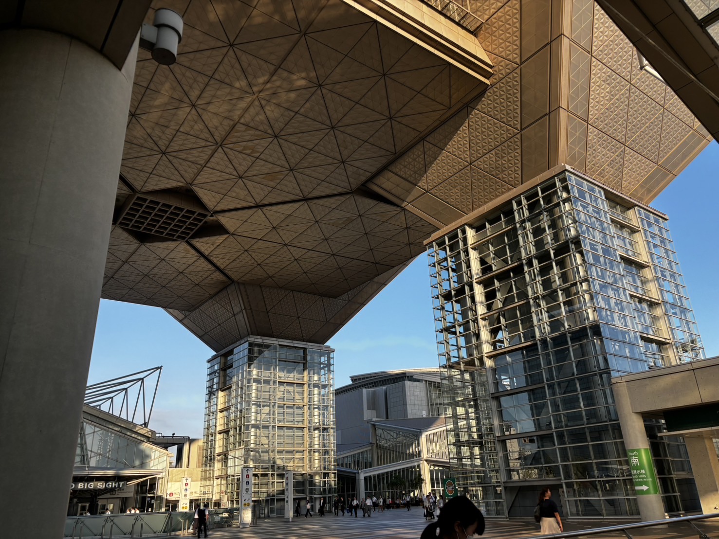 東京駅からビッグサイトへ向かうバスの中で、ビッグサイトを初めて生で見て興奮です。テレビで見たり建築士の学科試験で勉強したりと存在は知っていたものの、生で見たことも来たこともなかったんです。特徴的な4つの逆さの立方体を写真に収めようとしましたが、撮れた写真はこれです(笑)