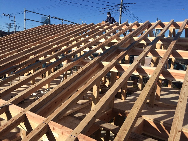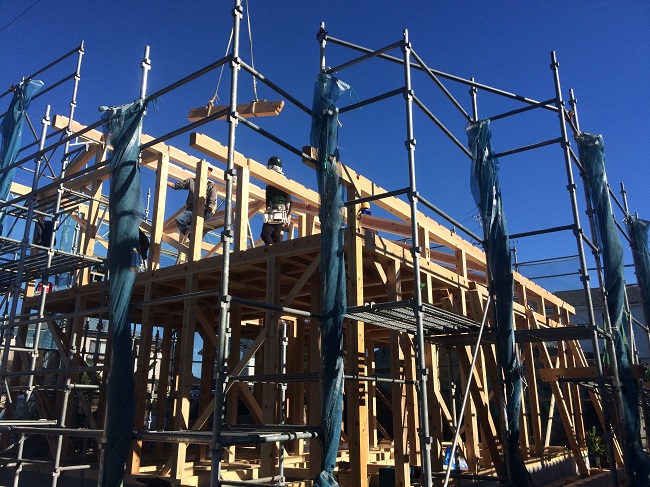 ↑ 前日の曇り空から快晴となった12月の良き日、太田の木の家建て方が始まりました。