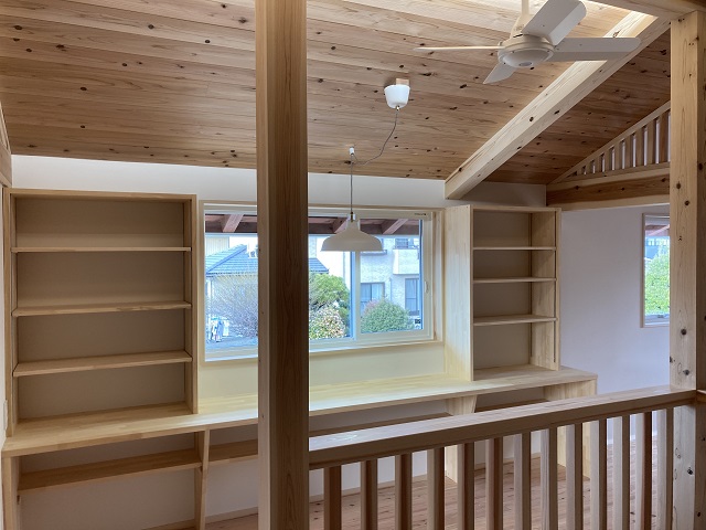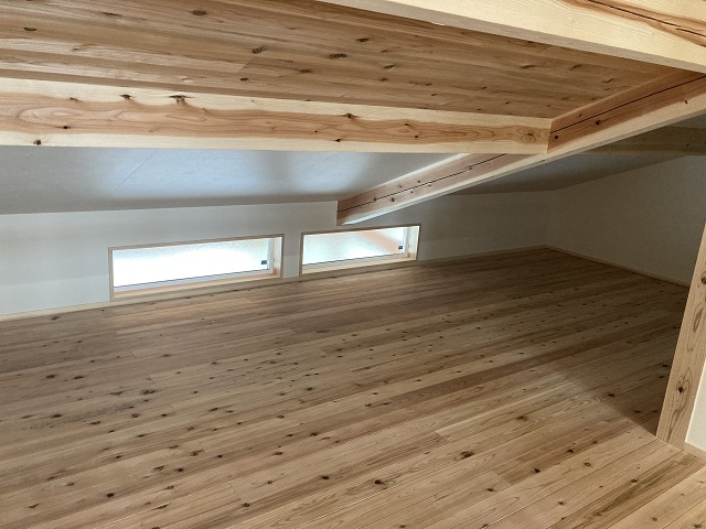 1階南面にはキッチン、パントリーとリビングがあって、リビング上は吹抜けとなっていますが、キッチン側の2階は下の写真にある小屋裏収納です。