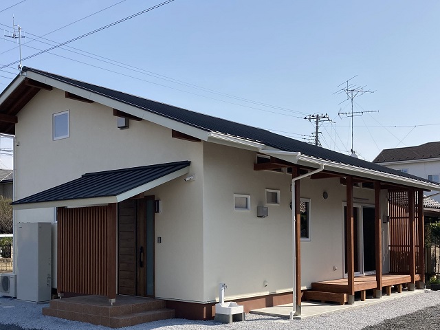 このような1階と2階の床面積が違う場合、一般的には平屋部分の屋根と2階部分の屋根が別々になりますが、1階も2階も一つのつながった屋根のしたです。