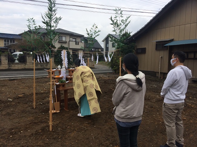 着工前の地鎮祭ですが、前日からの雨も上がり良き日和となりました。