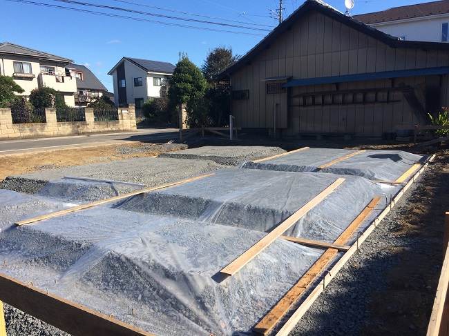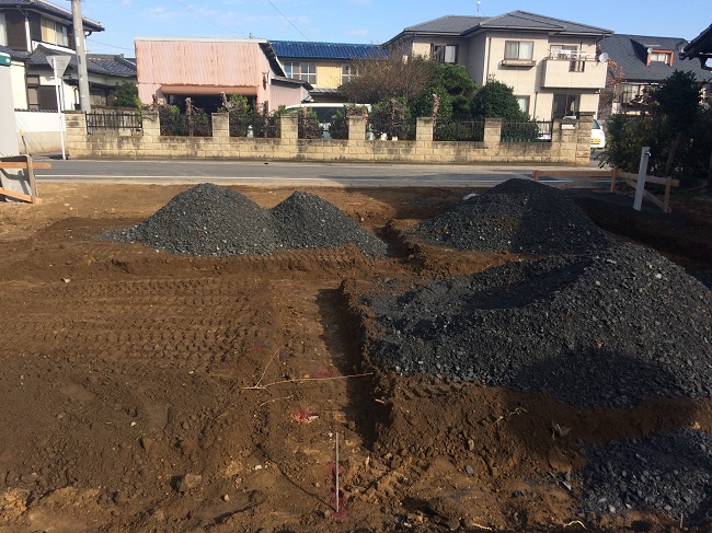 土地の高さが道路より低いため、基礎堀りした残土は殆どなく、逆に盛土の砕石が多くなる、そんな基礎工事となっています。