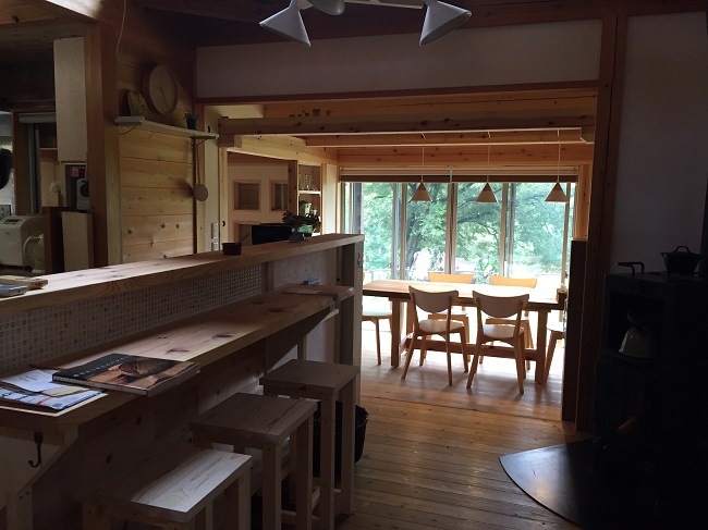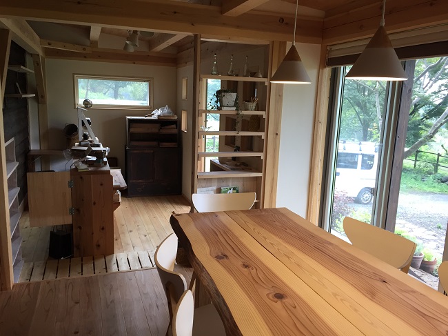 玄関入ってレジカウンター、靴箱、飾り棚、そして無垢板のテーブルとお施主さん自ら手造りの数々です。