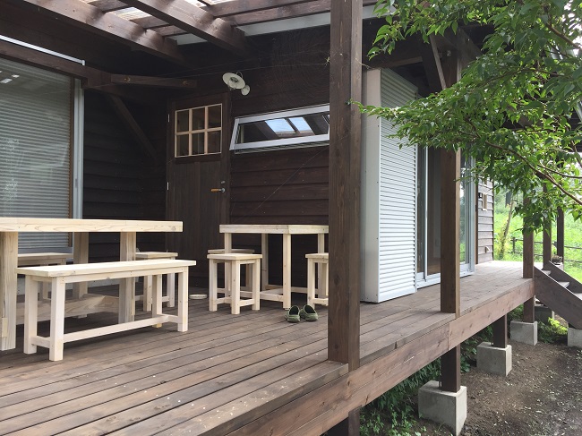 テラス付きのウッドデッキでも、手造りの椅子テーブルでお食事と休憩できます。