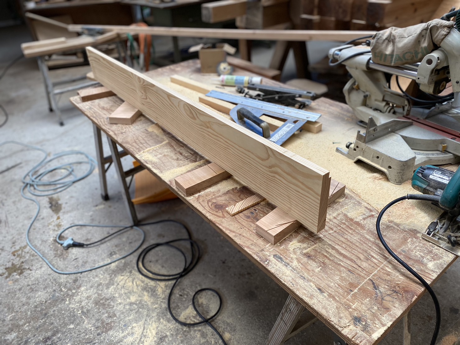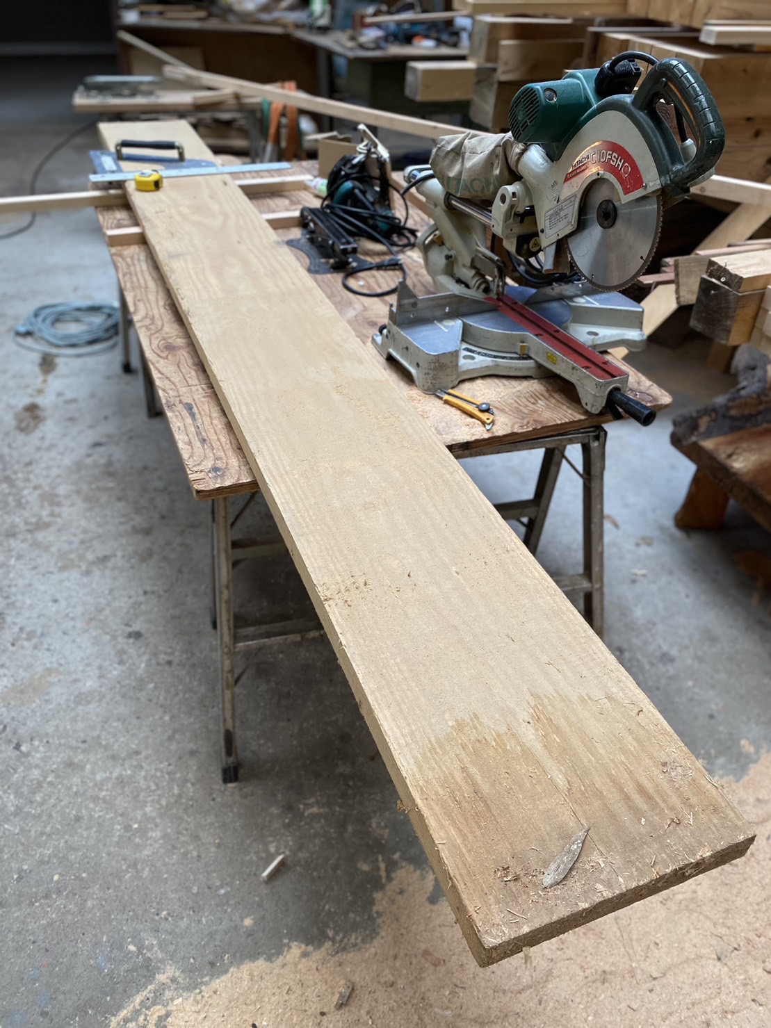 康之さんからこの材料を使ってと言われていた米松の板を、まずは必要寸法より少し大きめににカットします。