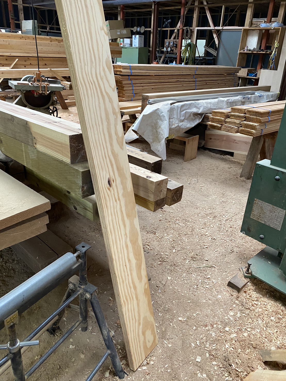 使う材料は中澤建設の作業場にある米松の1枚の板です。米松はあまり加工したことがなく、框を製作するのも初めてでした。その日は康之さんは勉強会で作業場にはおらず、大工さんの原田さんも用事があり休みでしたので一人での加工作業だったんです。