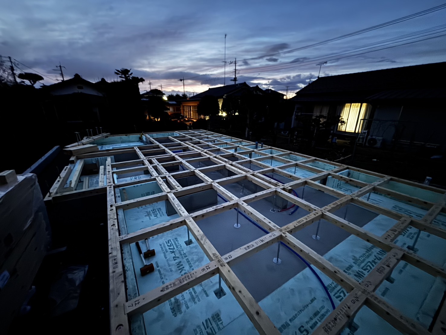 明日も土台敷きの続きで剛床を張ったりホウ酸を塗布したり、来週の建て方に備えて養生をしたりということをします。シロアリ対策として塗布するホウ酸は、水には弱いという性質があるので雨や雪はとても厄介になってきますが、今のところ来週の建て方までは寒いという予報ですが雨などの心配はなさそうなので一安心です。