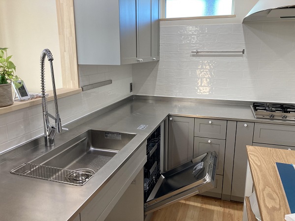 キッチンはウッドワンのL型キッチンで、食洗機は別手配からの入手となって、広々のこだわりキッチンんが完成となりました。