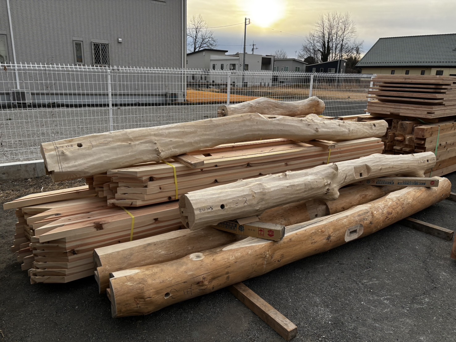 高崎の現場は店舗併用住宅で、修行期間中に計画が進められており、図面は僕が書いた思い出深い物件になります。月曜日の朝、現場に行くと中澤さんと社員大工さんの原田さんが手刻みで加工した丸太をはじめとする材料がありました。