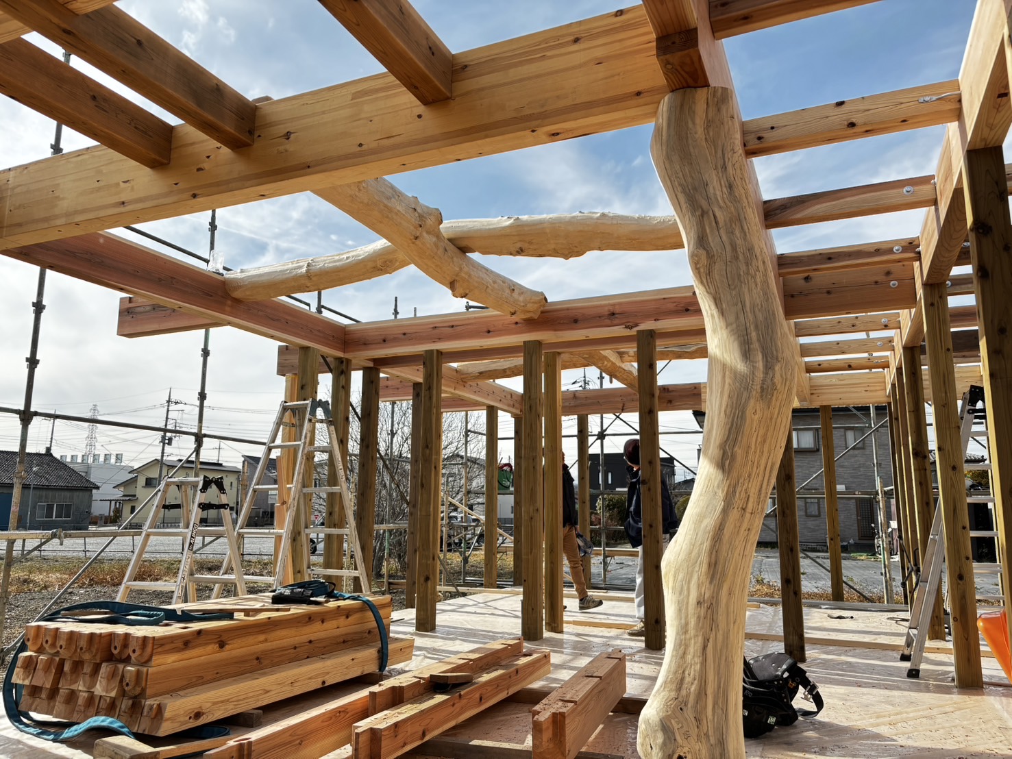 松島匠建はプレカット屋さんに加工はお願いしているので、全てを手刻みでやっている中澤建設さんはとてもすごいと感じます。真っ直ぐではないありのままの丸太を組み合わせていく作業の大変さは、製材された真っ直ぐな材料を刻んだことがない僕でもとても大変そうだなと感じます。