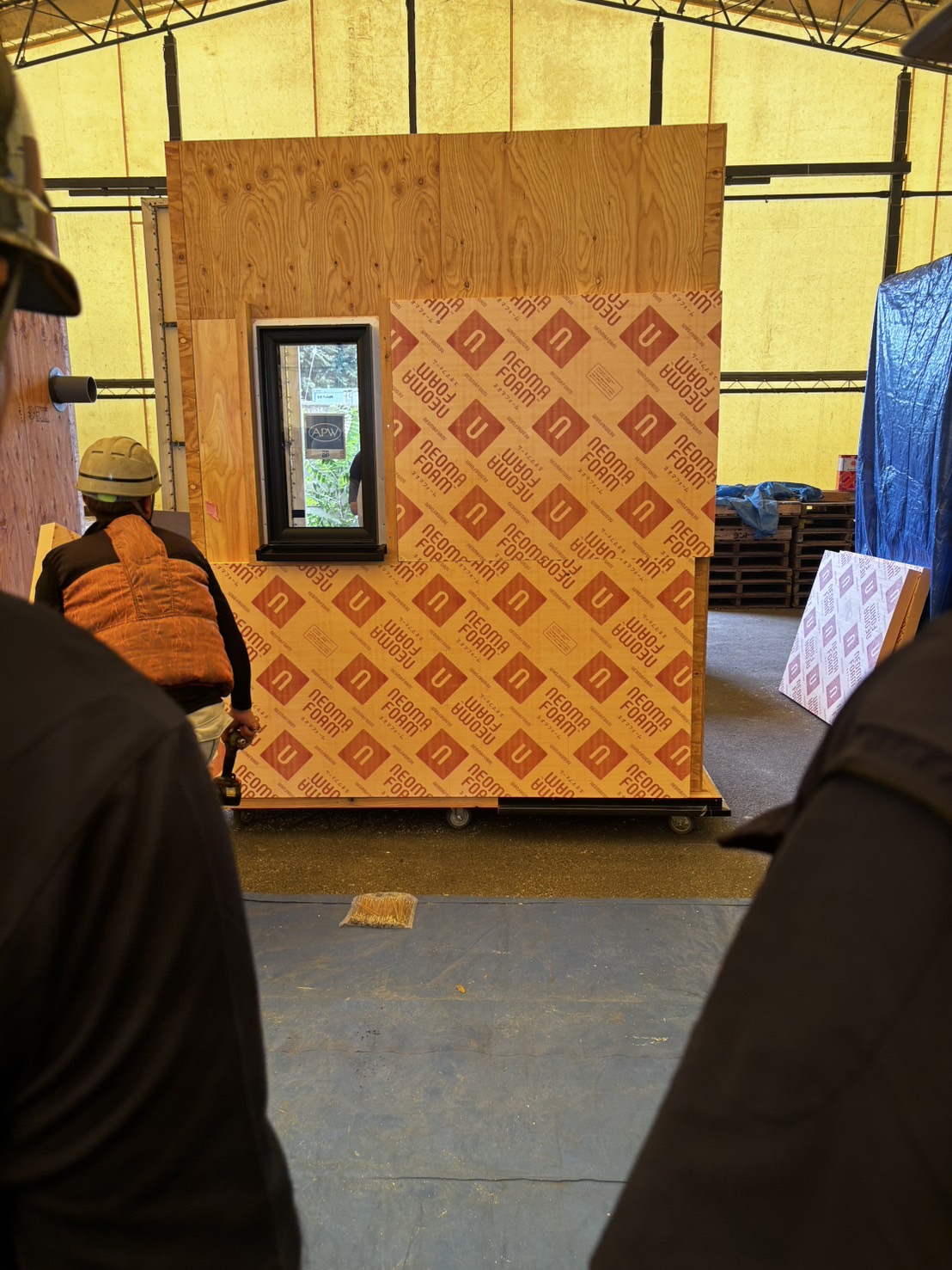基本仕様とは異なるネオマフォームの講習会になぜ参加したかというと、外張り断熱の基本的な考え方と施工の仕方を学びたいと思ったからです。午前中は壁・天井に充填と外張り、基礎内断熱でネオマフォームが使われており、人間の快適な生活空間を実現させようという設計で造られたネオマの家の見学と、同じ敷地内にある展示棟内での座学研修でした。