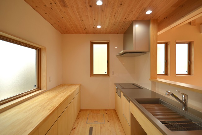 断熱仕様は屋根壁共に、いつもの付加断熱(ダブル断熱)で夏は涼しく冬は暖か、無垢の床と天井、そして珪藻土塗りの壁で、最高に空気が気持ち良く、雨の日も爽やかなお住まいとなっています。