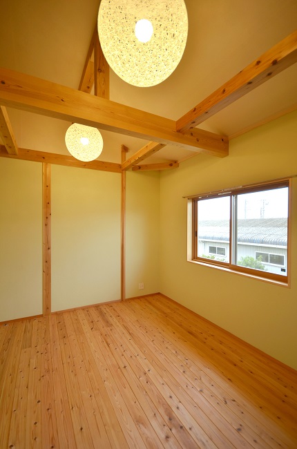 ↓ 2階寝室は杉赤身床板と外壁と同色の珪藻土「ナテュール」塗りです。