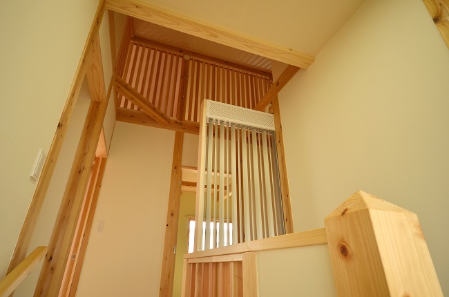 ↓ 階段上がって2階ホールには輻射式の冷暖房「エコウィン」を設置。
