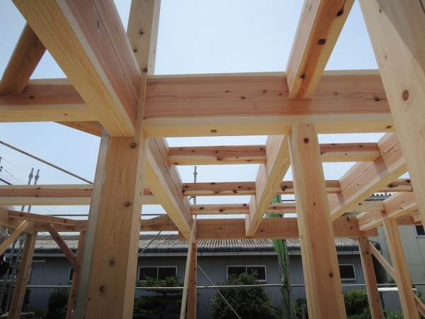 杉天然乾燥の大梁と檜5寸角の通し柱です。