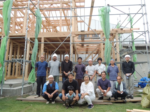 無事棟上げとなり、お施主様と松島匠建建て方チームの記念写真です。