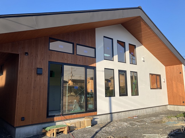 高萩の家は外部の足場が取り除かれ、STOの塗り壁、杉羽目板張り、そしてエクセルシャノンの窓がくっきりとお目見えとなりました。