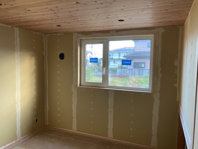 内部は大工工事が終了し、左官屋さんの珪藻土塗りが始まっています。