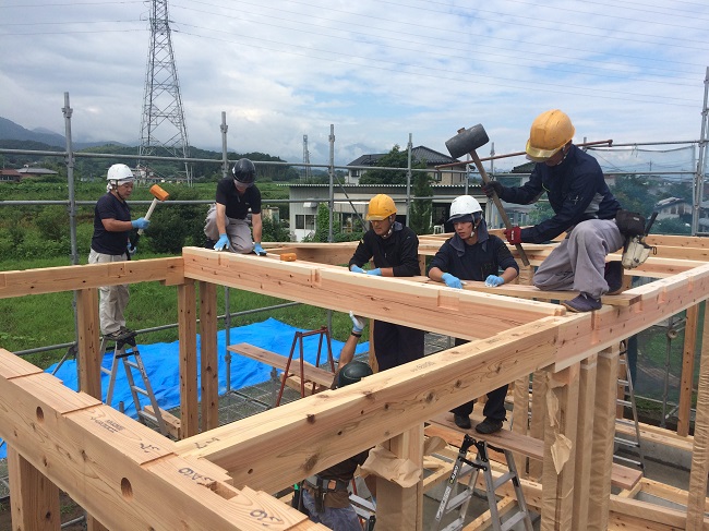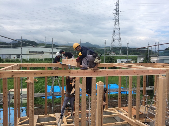雨が多く明けそうになかった今シーズンの梅雨のため、8月1日に予定通り建て方ができるかどうかが微妙だったことと、今回平屋建てと言う事で材上げのクレーン車は予約しないで、昔ながらの手上げ作業となりました。