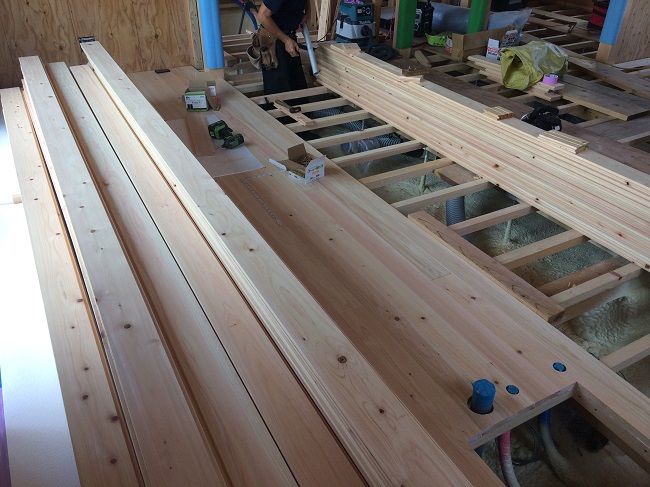 1階リビングの床板張りの様子ですが、12~15mmの薄いフローリング張りの場合は、下地に捨て張りの合板を張ってフローリング仕上げとなります。
