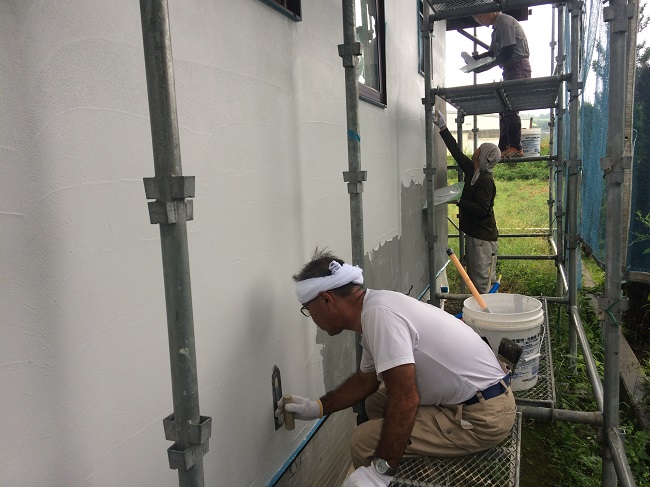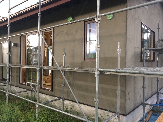 内部と共に外部も進行していますが、40mm厚のEPSボードに塗り壁下地のベースコートの下塗り壁です。
