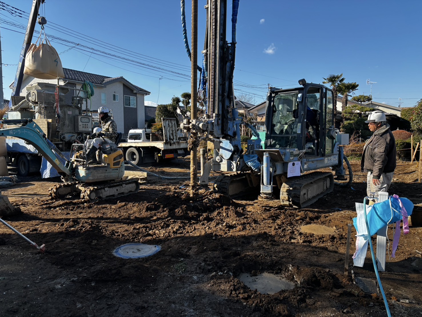 昨年末に、仮設の水道や電柱などを建ててはいただきましたが、本格的なスタートは木曜日に実施された地盤改良工事です。