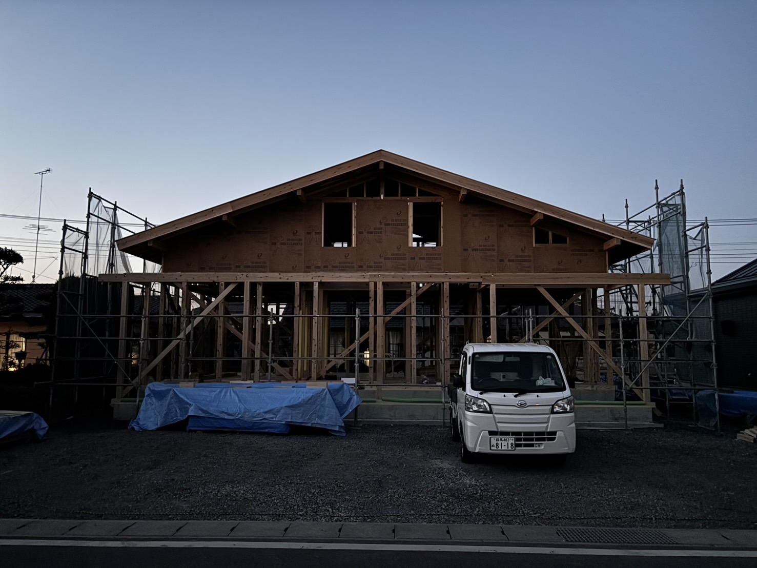 今週は館林市の新築、T様邸の建て方がありました。月曜日は祝日なのに材木の運搬屋さんが材料を現場まで運んでくださったり、足場屋さんが火曜日の朝から外部の仮設足場を組んでくださったり、水曜日の建て方に向けて色々な方が協力してくださいました。