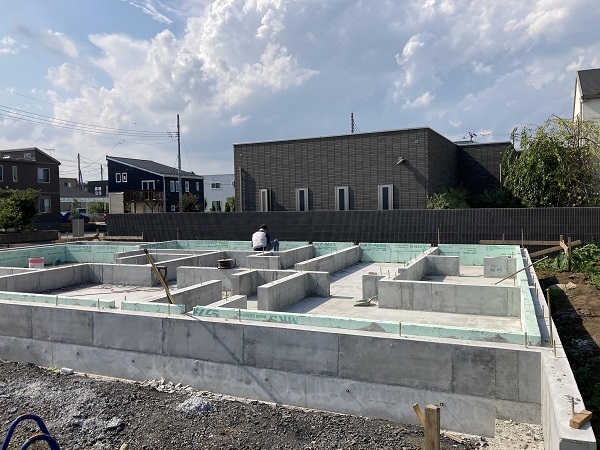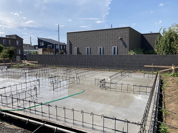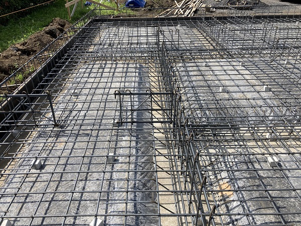 雨続きで遅れていた基礎工事でしたが、基礎屋さんの工夫で鉄筋工事まで進み、その後の梅雨明けで一気に進行しています。
