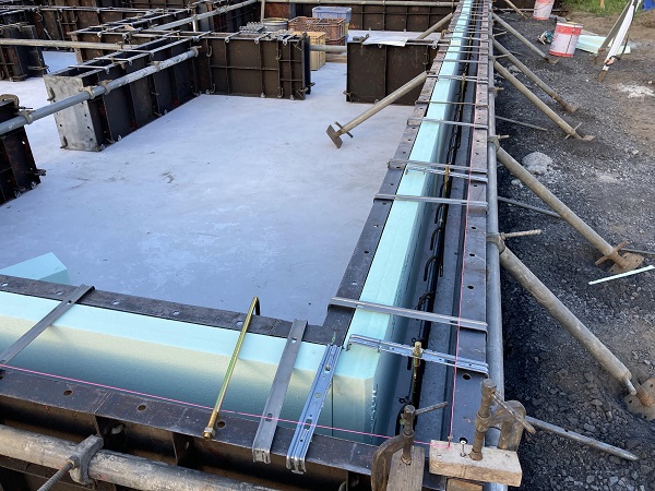 基礎外周部内側に基礎断熱のXPS75mmをセットし、コンクリートと断熱材の一体化を図ります