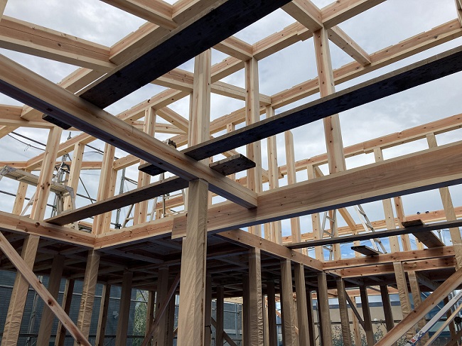 木材が高騰!手に入らない!そんな状況下の中、今回のお住まいは構造材の殆どを、弊社のストックヤードしておいた天然乾燥木材での調達となりました。