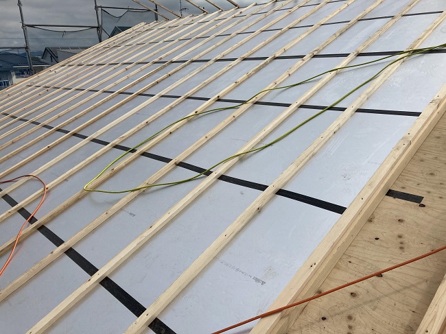 一般では垂木の上に野地板仕上げとなりますが、外張り断熱と通気層を設置しての2重野地板となるので、建て方からルーフィング貼りまで3日間掛かります。