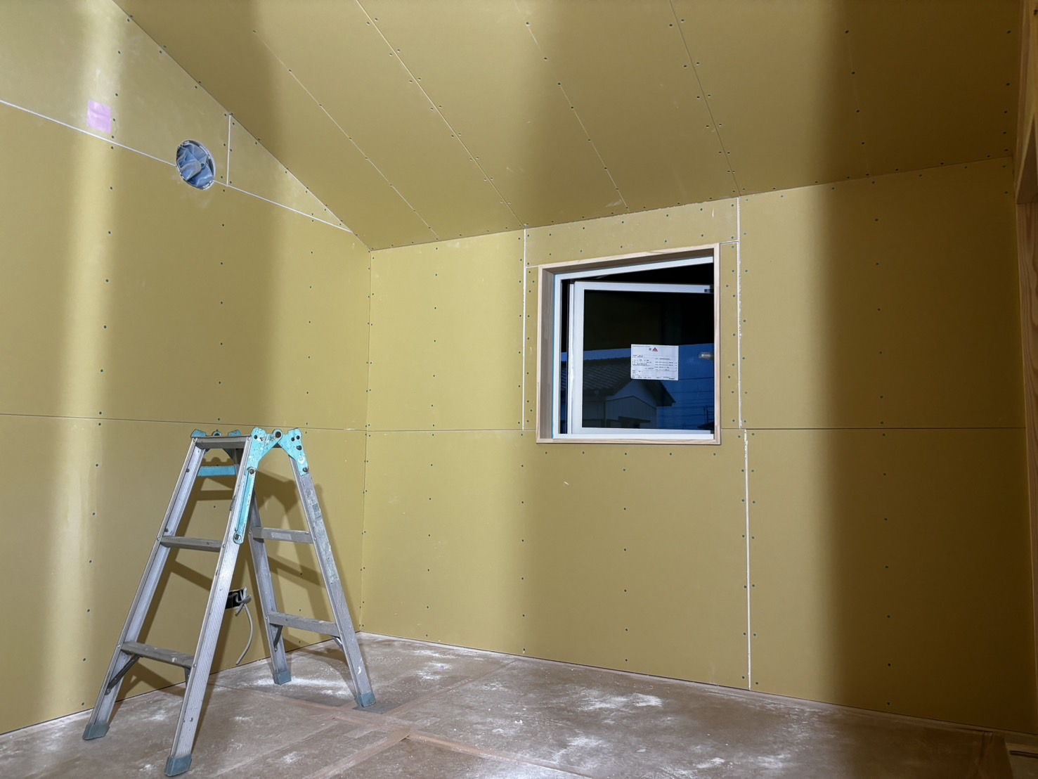 ボード張りは二階はほぼ終わり、今日から一階を張り始めました。細かなところが苦手です。少し大きめの寸法でカットして、無理やり入れると割れてしまいますし、逆に小さすぎると左官屋さんがパテをする時大変になってしまいます。ピッタリにすることはまだできませんが、スピードはもう少し速くしたいと思っています。3年前に比べたらきれいにできるようになってきましたが、大工さんが張ったところと比べるとまだまだです。