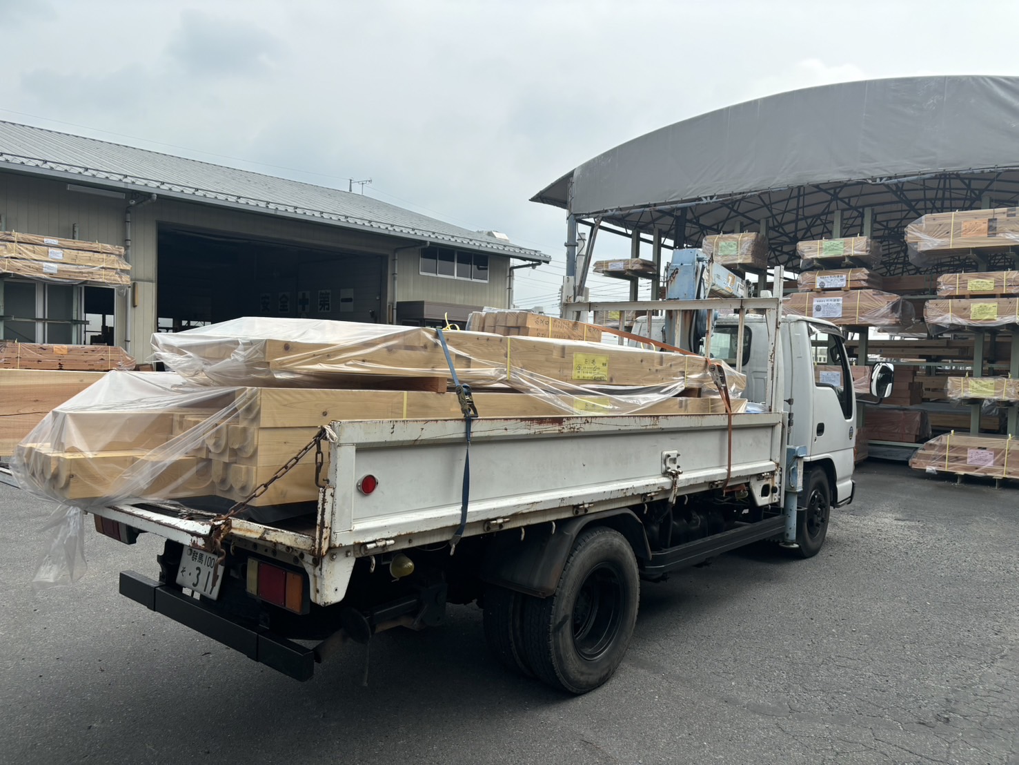 山で立派に成長した木は伐採され、一部を大間々の製材屋さんへ持っていき製材していただき、その木材屋さんの倉庫で梁などに使われる材は保管していただいております。