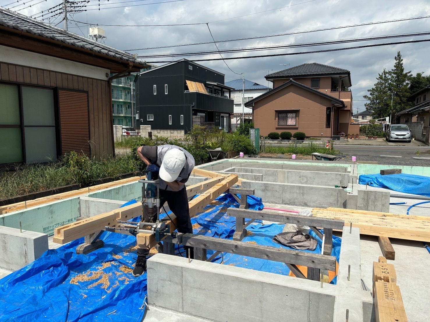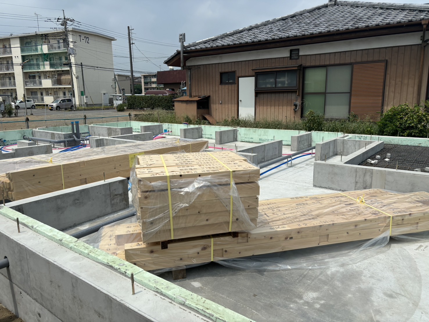 上の写真はプレカット屋さんで加工していただいた桧の土台と大引です。そしてこれを伊勢崎市の現場へ土台敷きが行われる前までに持っていき、現場でアンカーボルト部分などの穴開け作業が行われます。