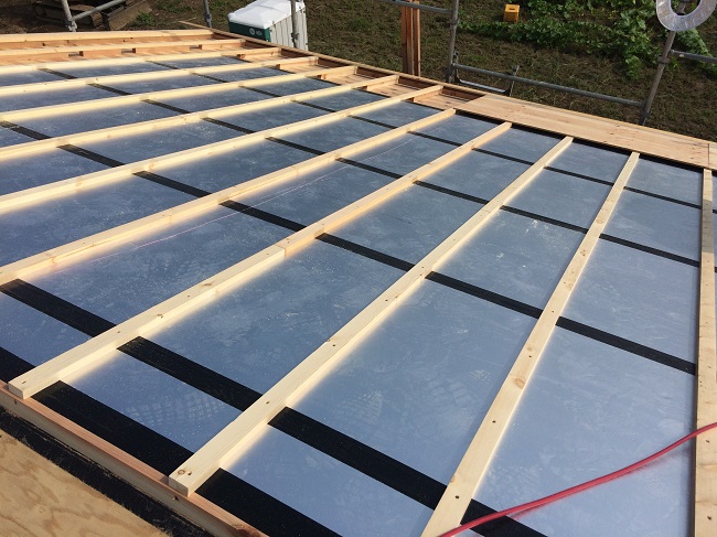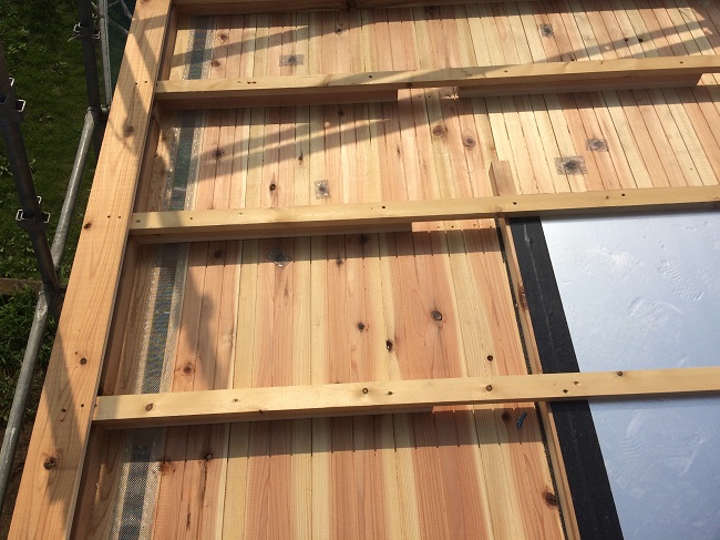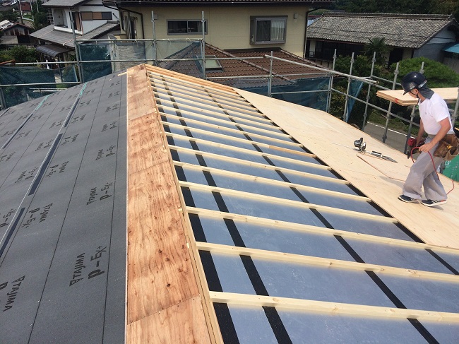 通気層の確保で再度野地板を張り、屋根下地の最後は丈夫なゴムアスルーフィングです。