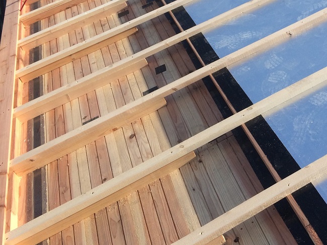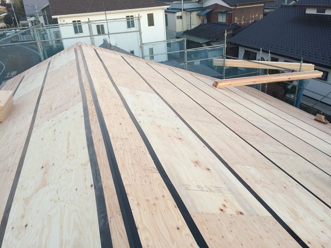 ↑ 垂木の上にまずは1段目の野地板張りからです。