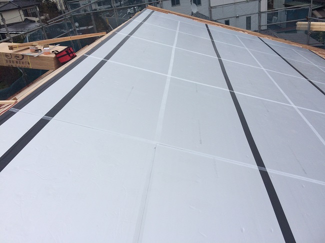 屋根外張り断熱は屋根の下地施工時に行うもので、建て方の終わった翌日から屋根の下地と共に外張り断熱の施工となっています。