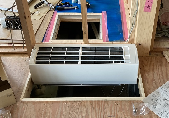 下の画像のように、エアコンの空気の吸い込みはエアコン上部なので、吸い込みと吹き出しは床下床上にハッキリ分けて設置します。