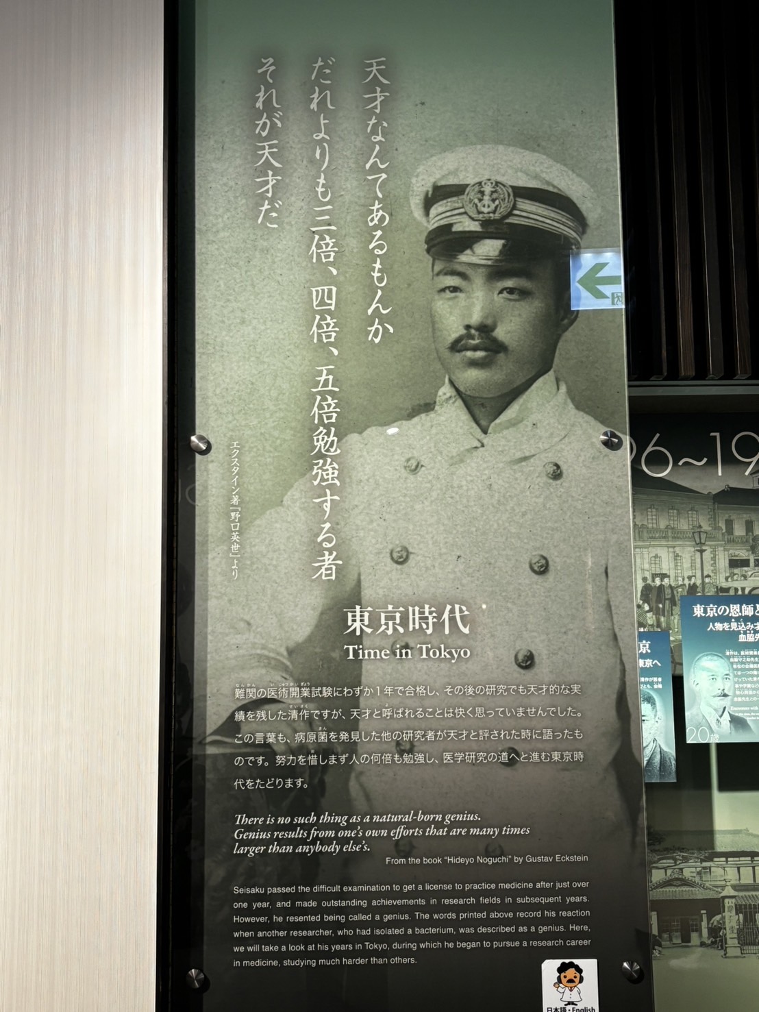 こんなにも強い決意ができるって凄いなと思いました。この刻まれた文の前でこの言葉の意味を考えた時とても感動して涙が出てきそうでした。19歳でこんなにも強い決意を持って自分のやりたいことに突き進んでいく意志。心が震えました。野口英世は19歳で自分が見つけた一つの道に向かって突き進んだということです。27歳の僕はまだできていないので本当に凄いと思いました。