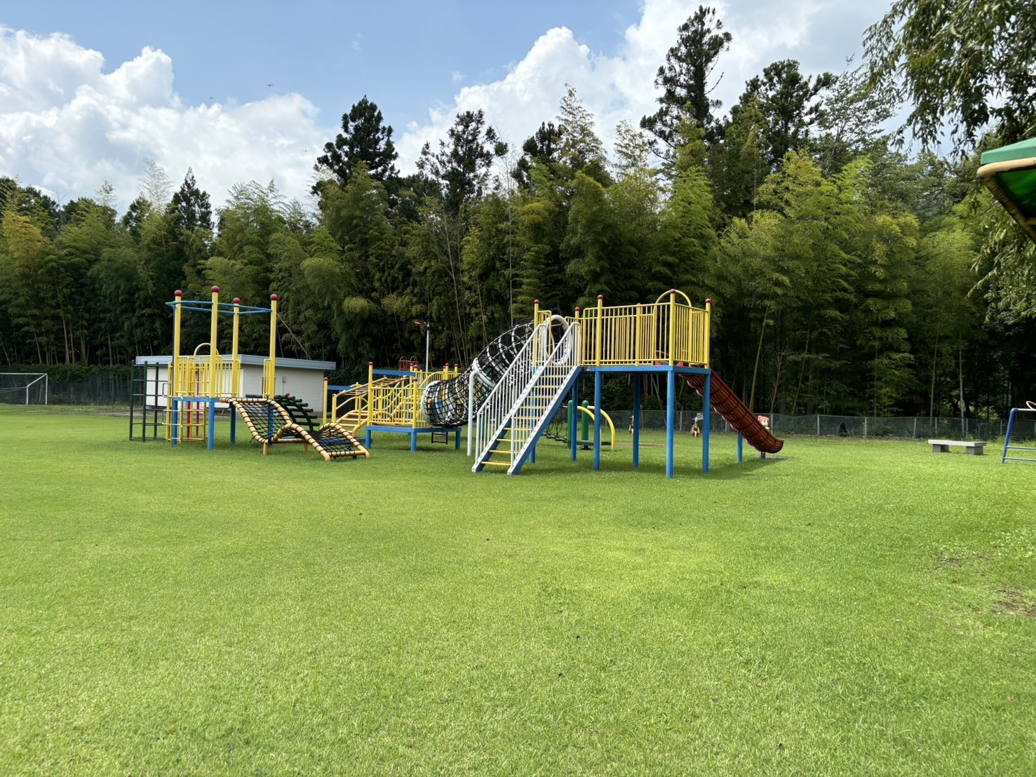 ここは東町で一番大きな公園です。野球場やテニスコート、体育館などがある施設の一部ですが、竹やぶや川などに囲まれた自然豊かな場所にあります。