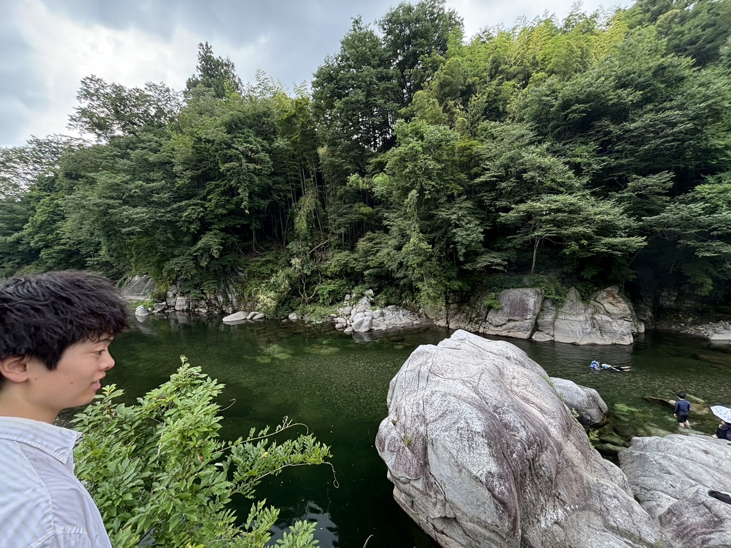 ここは、僕の実家から歩いて5分の所にある大人気の川遊びスポットです。流れが穏やか、深くない、そして何よりも水が透き通っていてキレイ!群馬県ナンバーの車もあるし、県外ナンバーも車もあるように、夏になるとここに人が集まります。真ん中の岩は高さが5~6mほどあり、飛込スポットとして大人気なんです。僕はビビりなので飛び込めません(笑)。