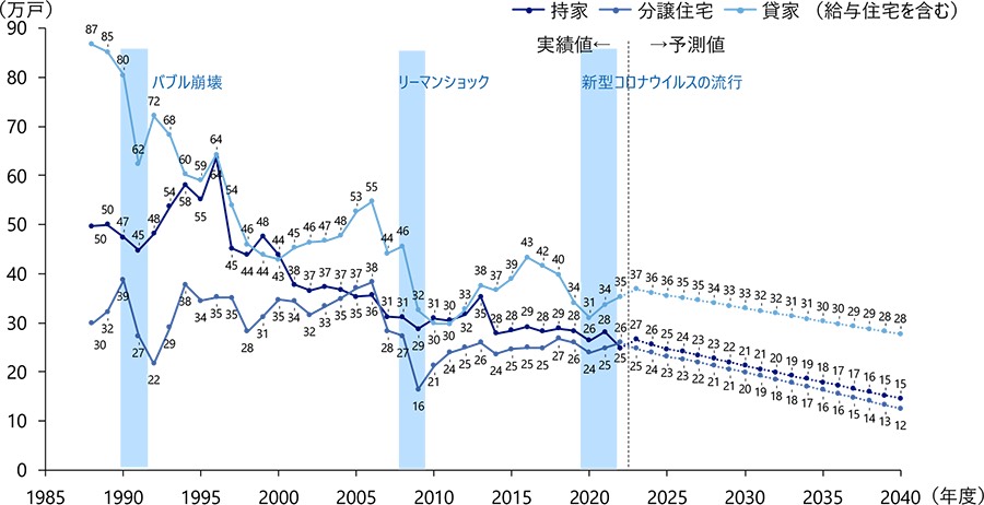 皆さんは今の日本が少子高齢化社会であって、人口がどんどん減っていっていることはご存じだと思います。それと同じく、新築住宅の着工数も減っているんです。