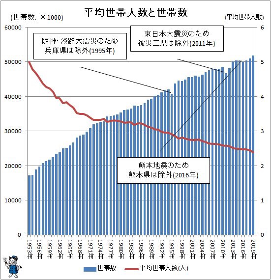 少し前の時代は子・親・その親と三世代で一緒に暮らすことが多かったと思いますが、今は上のグラフでもわかる通り、平均世帯人数が減ってきているので、親世代、子世代がそれぞれ別に暮らす風潮になっています。そのため世帯数が増えているんですね。