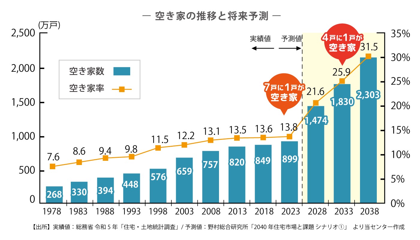 誰かがその家に住もうと考えたとしても、田舎のほうであれば街に比べて生活も不便だし、建物もいたるところに不備が出ていたりすれば、「やめた」となり、空き家として放置されます。街を歩けばその状況を感じるし、下のグラフを見てもわかると思います。あくまでも予測値ですが、今後10年での空き家の数がとても多いですね。