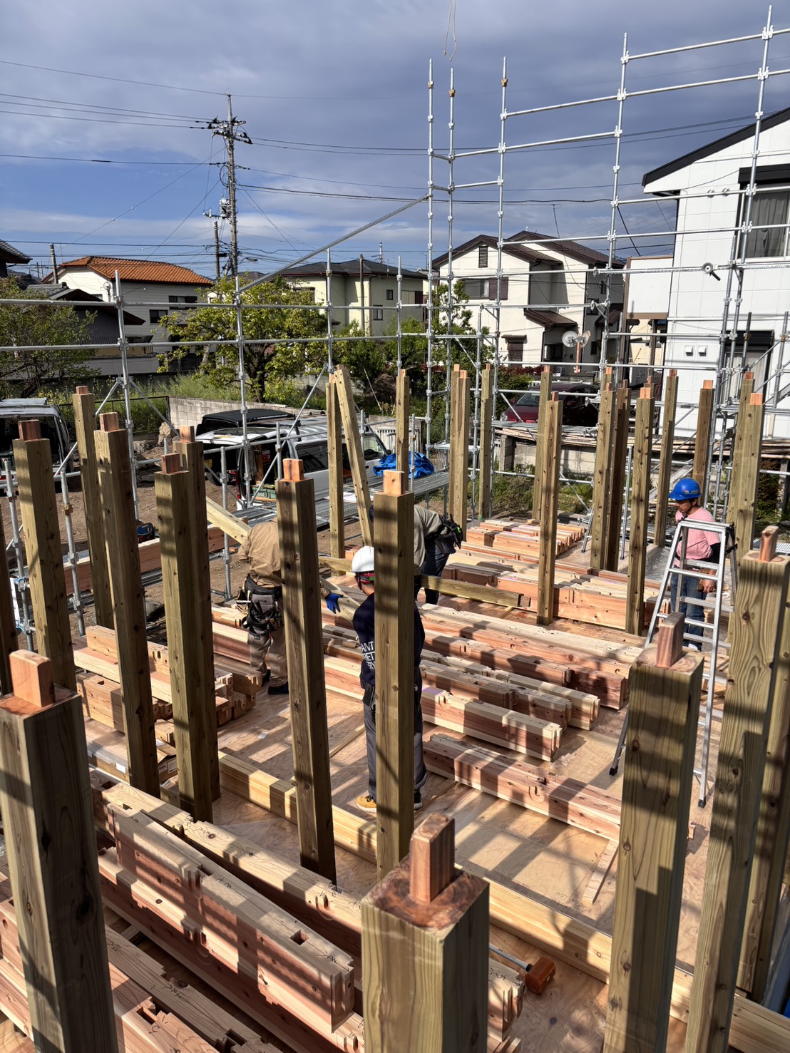 中澤建設さんの建て方は僕も特別な想いがあって参加しています。このM様邸は僕が修業期間中にお問い合わせがあったお客様で、現地調査や役所調査などをさせてもらいました。図面作成や建築確認申請もやらせていただいているので、紙面上の二次元から、原寸大の三次元へと姿を変える瞬間でもあるんです。「こうなるんだ!」という感動が毎回生じます。