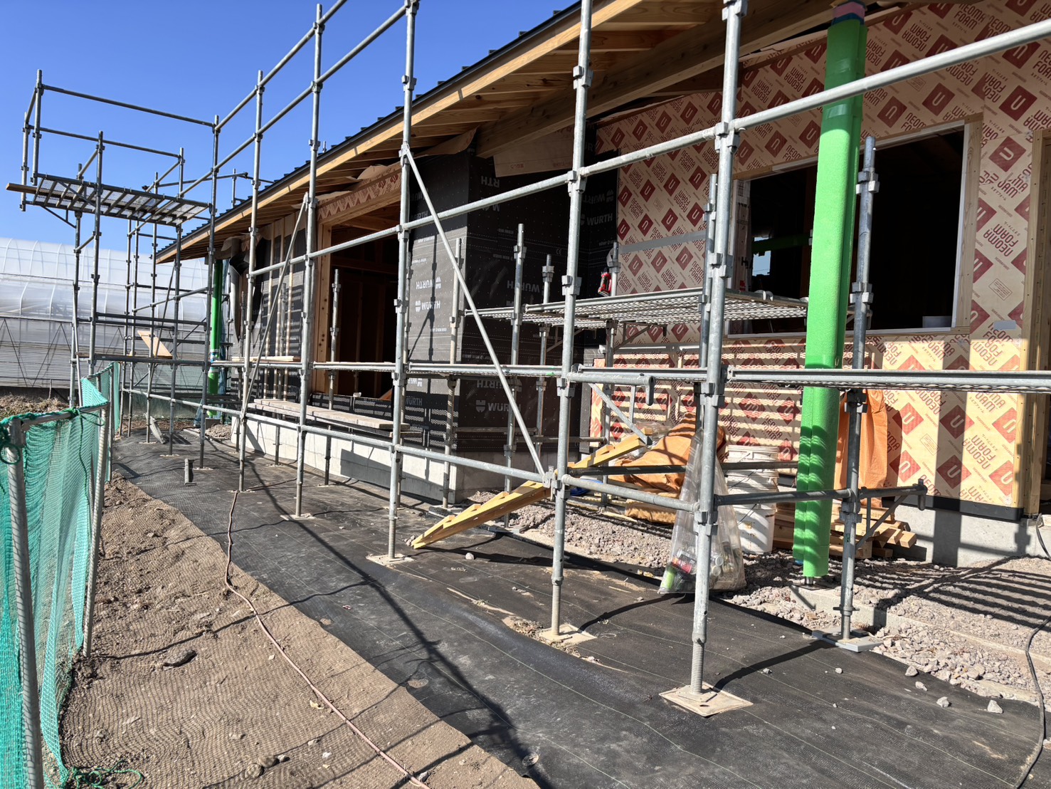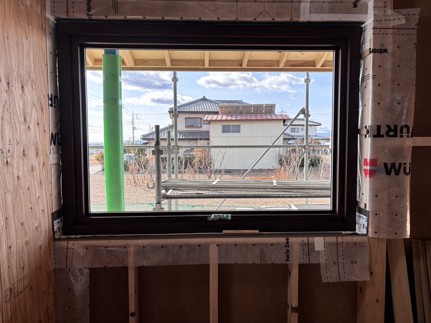 しかし、今週木製サッシが入り、室内から外を見たときに「うわぁ、すげぇ!」と感じたんです。そこから見える景色は壮大な山でもなく川でも街でもありません。隣地に建っている一軒家と仮設足場なのですが、窓枠に使用されている信州カラマツが一軒家を含めた景色、青空を切り取っていました。