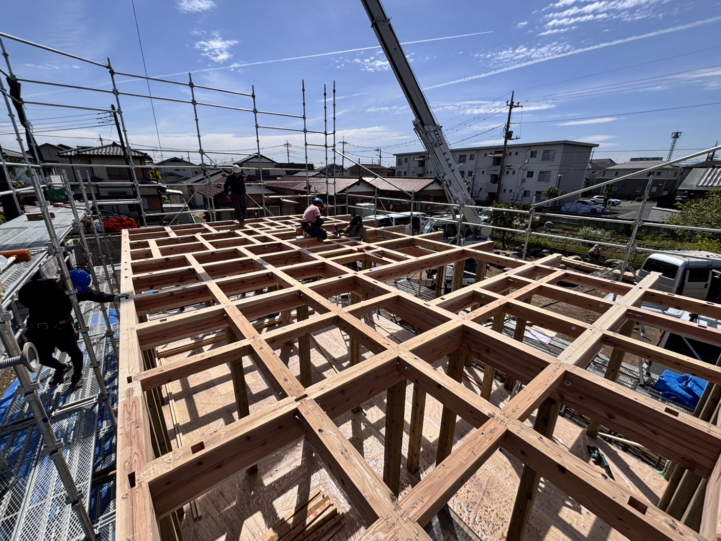 中澤建設さんの建て方は僕も特別な想いがあって参加しています。このM様邸は僕が修業期間中にお問い合わせがあったお客様で、現地調査や役所調査などをさせてもらいました。図面作成や建築確認申請もやらせていただいているので、紙面上の二次元から、原寸大の三次元へと姿を変える瞬間でもあるんです。「こうなるんだ!」という感動が毎回生じます。
